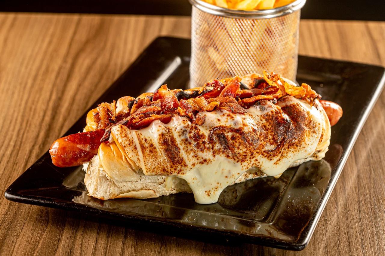 Linguiça no pão brioche com queijo maçaricado e bacon crocanteR$ 29,90